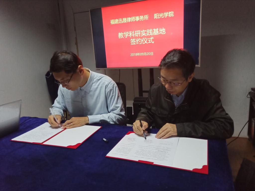 会上,王雨主任首先介绍了福建迅晟律师事务所的基本情况,福建迅晟律师事务所是一家经福建省司法厅核准成立的专业律师事务所,律所总部位于风景秀丽的闽江江畔鳌峰广场,办公面积达300平方,律师执业人数为12人,律所主要为企业提供法律顾问、法律纠纷处理、法务外包等各项服务,特别对处理人力资源相关法律事务有丰富的实践经验,律所为中信银行福州分行、新奇特车业服务有限公司、金太阳养老集团、中庚物业等众多优质企业提供律顾问,并获得企业的高度评价。2017年8月,共青团福州市委员会正式将“福州市青年创业就业见习基地”授予该所,成为福州市率先推广高等院校、律师事务所与优质企业完成三方校企对接的法律服务机构。邹雄主任介绍了阳光学院概况及法学专业人才培养的特点,感谢福建迅晟律师事务所为阳光学院师生提供挂职锻炼及实习实训的平台,希望双方在合作中资源共享、优势互补、合作共赢。随后,双方签订了“教学科研实践基地”共建协议。