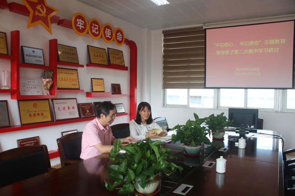 2019年10月11日,法律系党总支组织召开“不忘初心,牢记使命”主题教育第二次集中学习研讨,此次集体学习内容是《习近平新时代中国特色社会主义思想学习纲要》,并围绕“加强高校党的政治建设,营造良好校园政治生态”主题开展讨论,会议由系党总支书记主持 。