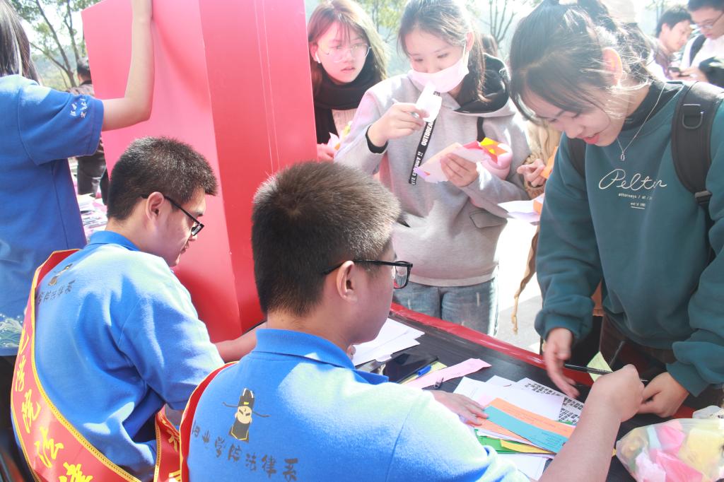 2019年12月4日是我国第六个国家宪法日。活动当日,由我系50名志愿者组成的队伍,在活动开始前提前到场,摆放帐篷、桌椅,将事先准备好的横幅、海报悬挂,以确保活动的顺利开展。准备工作结束后,志愿者们纷纷站立成队,热情高涨地喊响法律系“法韵风流,勇争上游;法律群芳,笑傲阳光”的口号,吸引了校园内大批学子的注意,纷至沓来,踊跃参与。通过现场志愿者们耐心的引导、介绍,同学们熟悉了游戏规则,而后活动正式开展。志愿者们组织同学们进行有序答题,对同学们摘下的法条进行及时的补足、对答和兑奖。同时在整个活动过程中,组织志愿者在食堂各个出口和活动现场进行相关主题的宣传单发放。现场洋溢着浓厚的学法、尊法、用法的法治氛围,同学们纷纷表示通过此次“法条对对碰,趣味普法”活动,改变了宪法在他们心中“冷冰冰”的形象,在今后的生活中,他们会更加注重培养自己的法律意识,学法尊法守法用法。