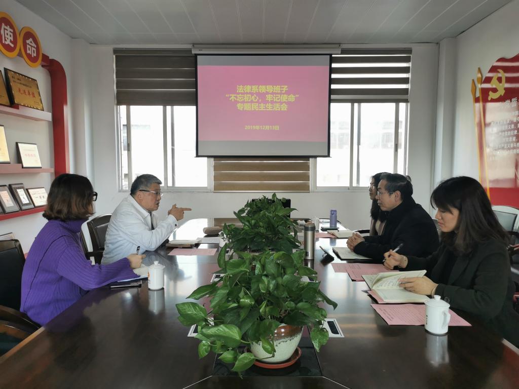 2019年12月13日,法律系在文科楼五楼会议室召开了领导班子“不忘初心、牢记使命”专题民主生活会,刘通副校长参加,会议由党总支副书记黄玲主持。