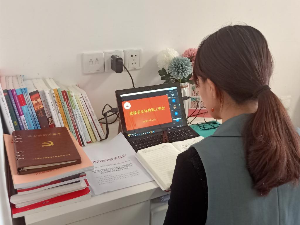 法律系主任助理吴晶宇老师进行“云安排”。传达4月17日召开的有关日本广岛大学联合办学、专业调整、两化课程等教学工作会议精神。安排下阶段教学工作,尤其是毕业班课程、论文答辩、毕业实习材料归档等有关工作,确保教学环节各项工作有序进行。同时反馈期中学生座谈会情况,结合课程检查情况,提出课程建设的改进建议。探讨教学环节如何加强考研专业课训练,使专业课成为考研的拉分项。