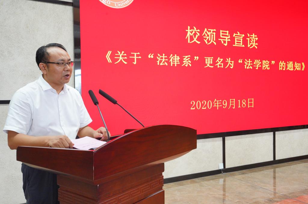 最后,校党委陈少平书记对法律系更名为法学院表示祝贺,并对原法律系在人才培养工作的成绩表示充分的肯定。他指出,法学院的成立,是学校发展史上的大事,是打造全国应用创新型大学标杆的一项重大战略举措,也是贯彻落实习总书记“立德树人、德法兼修,抓好法治人才培养”的具体行动。习总书记多次强调,“法治人才培养上不去,法治领域不能人才辈出,全面依法治国就不可能做好”。国势之强由于人,人材之成出于学。在全面推进依法治国、建设法治中国的进程中,学校高度重视法学教育的发展,高度关注高素质应用型法律人才的培养,在三年攻坚战的关键时期成立法学院,必将大力促进我校法学专业人才培养、教学科研工作上台阶、上层次,也对我校为地方经济建设提供高水平、全方位、多层次的服务,产生积极而深远的影响。
