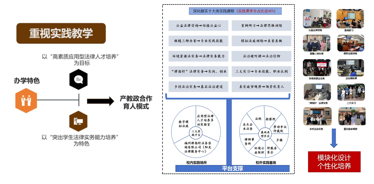 教学设施:法学院始终重视各类教学设施的建设与应用型人才的培养相匹配。现建有数字模拟法庭、福州律指针法务咨询有限公司(阳光法律服务中心)、应用型法律人才培养多功实验室等多个学生实战实训平台,锻炼学生的思辨能力、语言表达能力、应变能力和团结协作能力,提升学生的专业素养和综合素养。