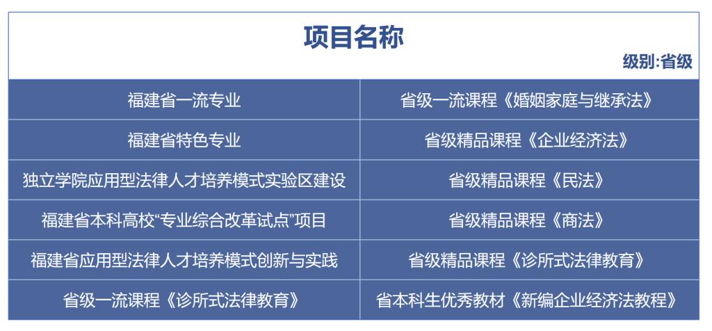 l 近年来法学专业先后被福建省教育厅评定为“福建省一流本科专业”(省级金专)、“福建省特色专业”、“福建省本科高校专业综合改革试点项目”等荣誉称号。