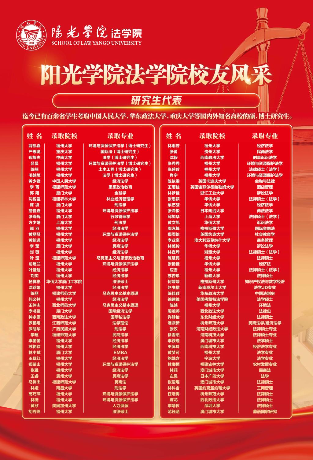 l 迄今已有百余名毕业生考取中国人民大学、华东政法大学、西南政法大学、厦门大学、福州大学、英国卡迪夫大学、澳门科技大学等国内外知名高校的硕士、博士研究生。